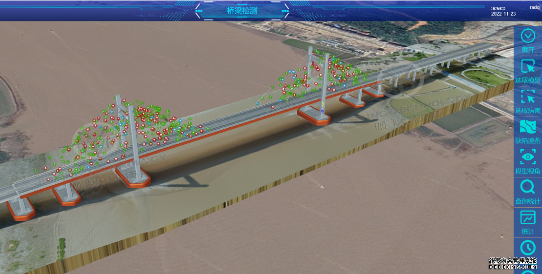 根據拍攝的高清圖像重建橋梁三維模型,并定量標示各類缺陷的位置,并且搭建獨立的大數據云平臺,實現橋梁缺陷與病害的可視化,對橋梁問題進行三維立體化復現,為橋梁安全運行提供數據支撐。