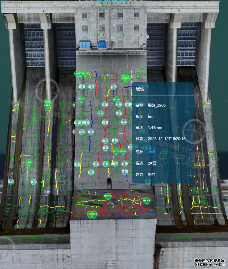 珈鷹科技運用AI視覺技術(shù)對滲漏、表面結(jié)構(gòu)破損、裂縫等病害進行智能檢測,并實現(xiàn)目標對象的坐標定位及精準量測,在此基礎(chǔ)上對壩體進行三維實景建模,缺陷自動映射,在三維可視化平臺上持續(xù)更新,為大壩構(gòu)建量身定做的“病歷”數(shù)據(jù)庫。