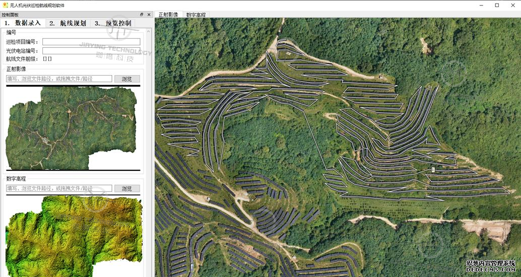 分析DOM正射影像和DEM數字高程模型,分析光伏電站的布局和地形特點,精細化規劃無人機的飛行路線,將光伏板的排列、地形的高程變化以及潛在安全隱患等因素考慮在內,優化路線,進行巡線仿地飛行。