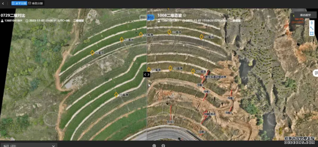 利用仿地飛行功能,無人機能夠對邊坡等復雜地形進行定時數據采集,并標注缺陷,通過多期對比查看模型變化,從而精準定位隱患區域,了解邊坡變化趨勢。